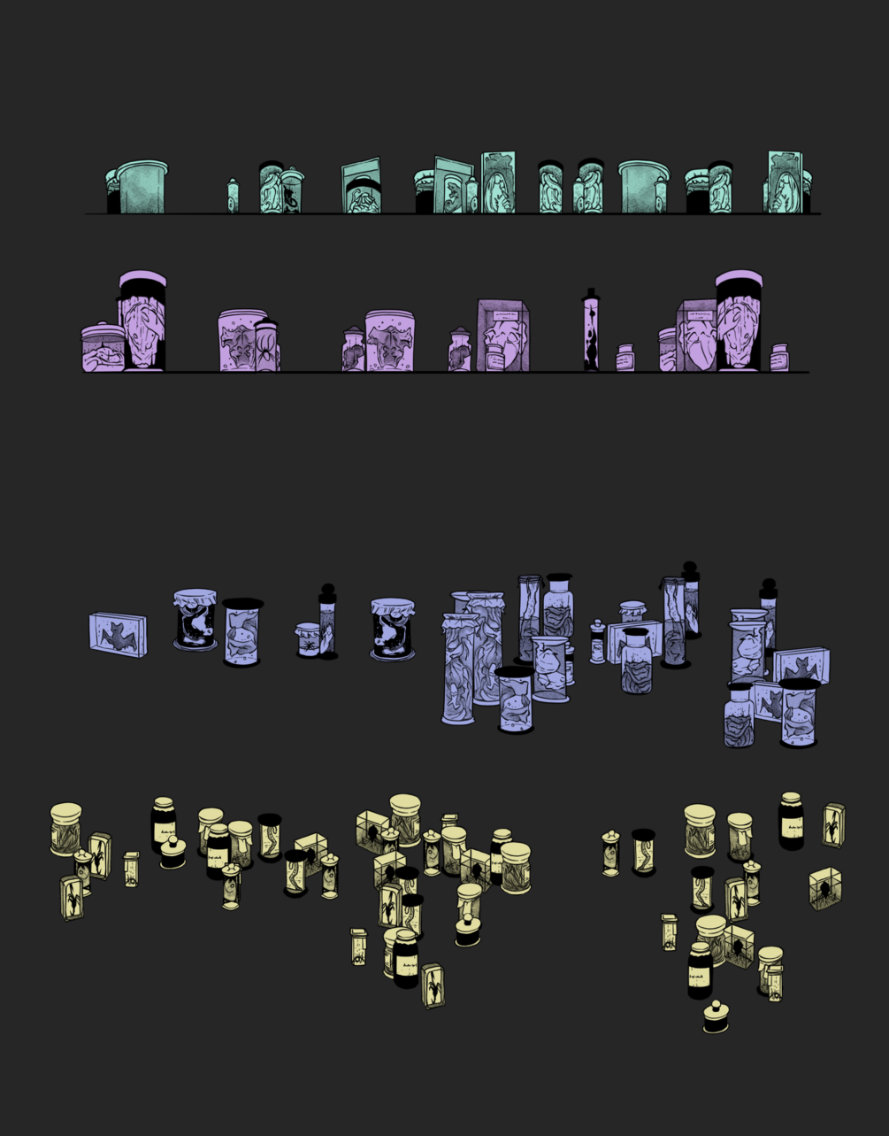 #comic #comics #skull #skulls #animal #antiques #formalin #glasses #sack #sacks #trophy #trophies #potion #pharmacy #old #antiques #antique